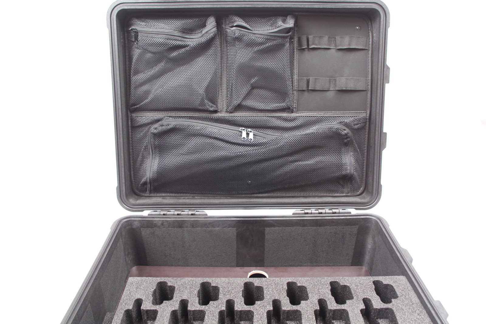 - Netzeinteiler im Kofferdeckel: Der Deckeleinteiler bietet zusätzlichen Stauraum für weiteres Zubehör wie Tarnsets, Gürtelclips oder Kleinteile, die sicher und griffbereit aufbewahrt werden sollen.